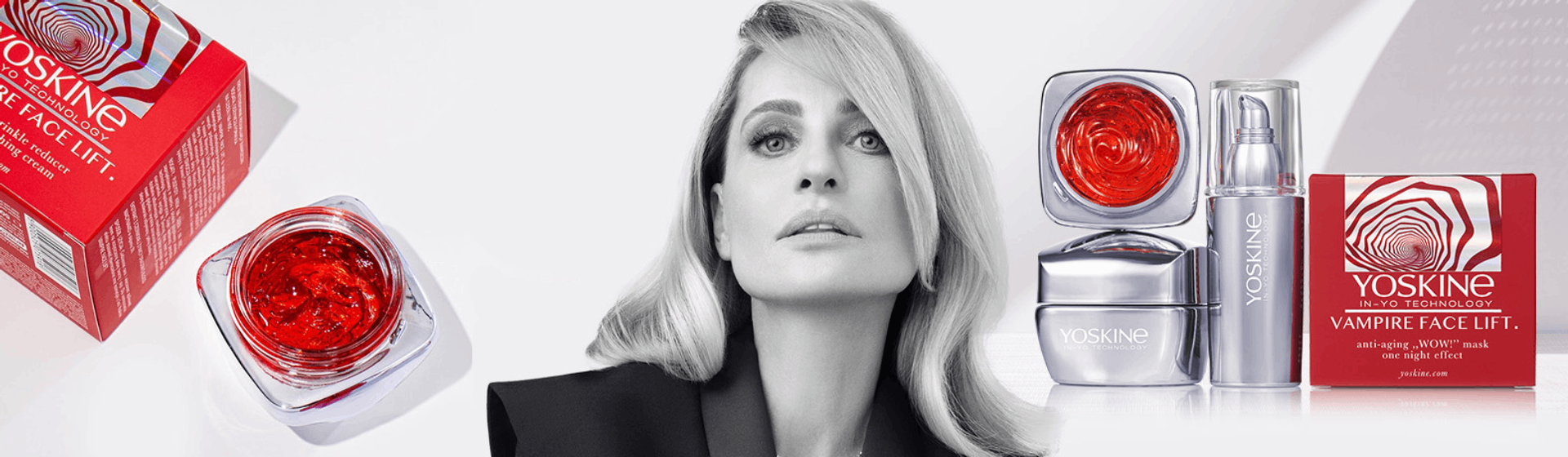 Linia Yoskine VAMPIRE FACE LIFT to zaawansowane kosmetyki przeciwzmarszczkowe, inspirowane wampirzym liftingiem. Główne składniki to "Smocza Krew" (żywica Croton lechleri) o silnych właściwościach regenerujących oraz niacynamid i peptydy, które redukują zmarszczki i poprawiają jędrność skóry. Dzięki technologii IN-YO kosmetyki detoksykują komórki i intensywnie odmładzają cerę. W skład serii wchodzą serum, kremy na dzień i na noc oraz maska zapewniające kompleksową pielęgnację anti-aging.